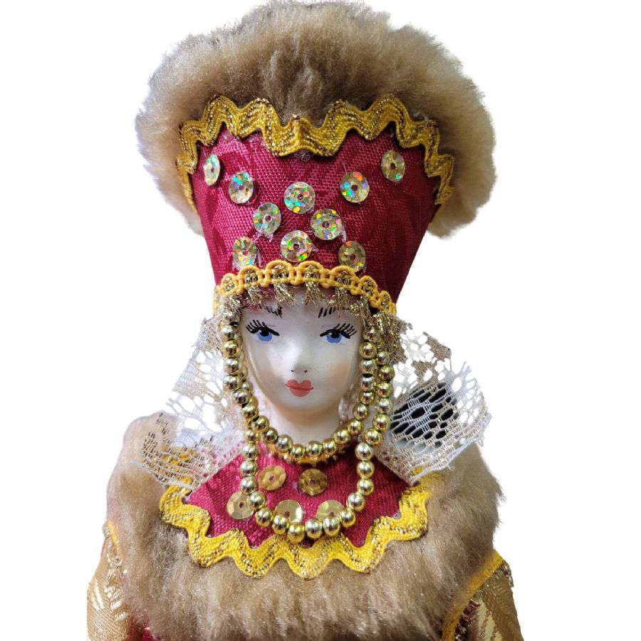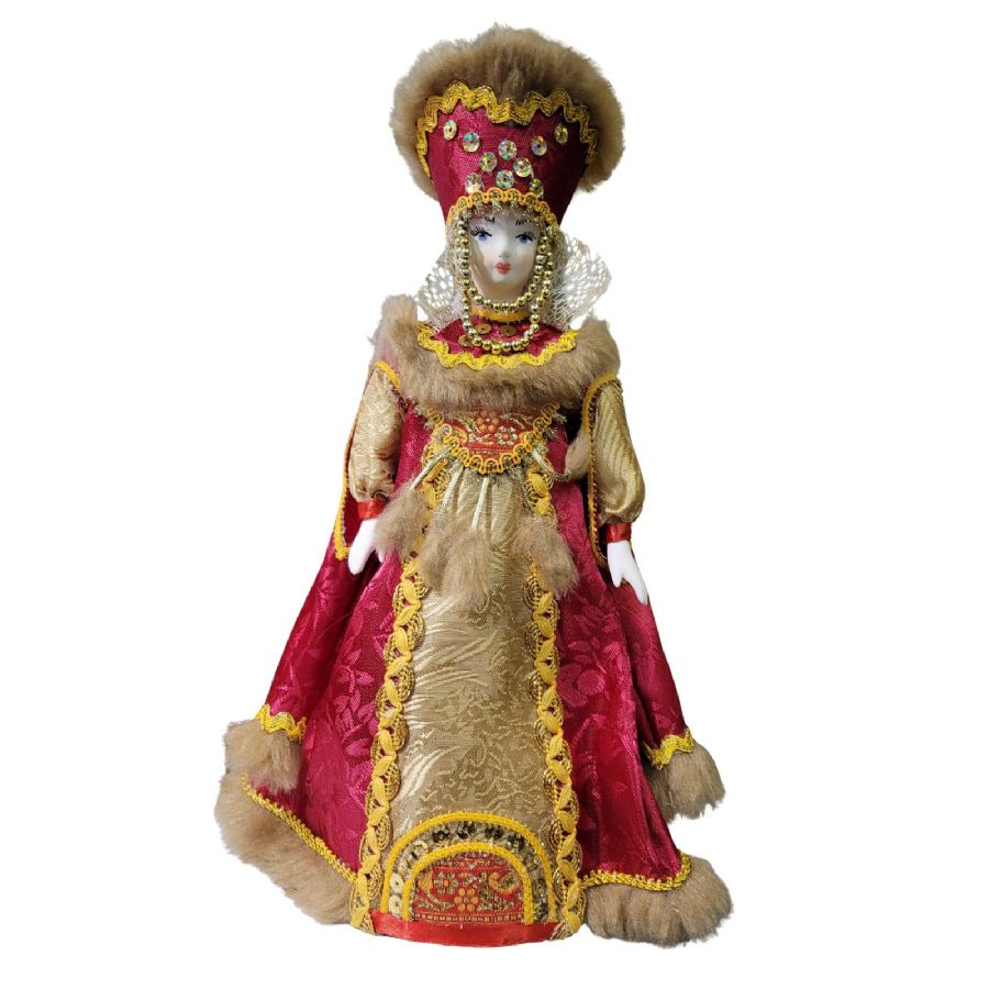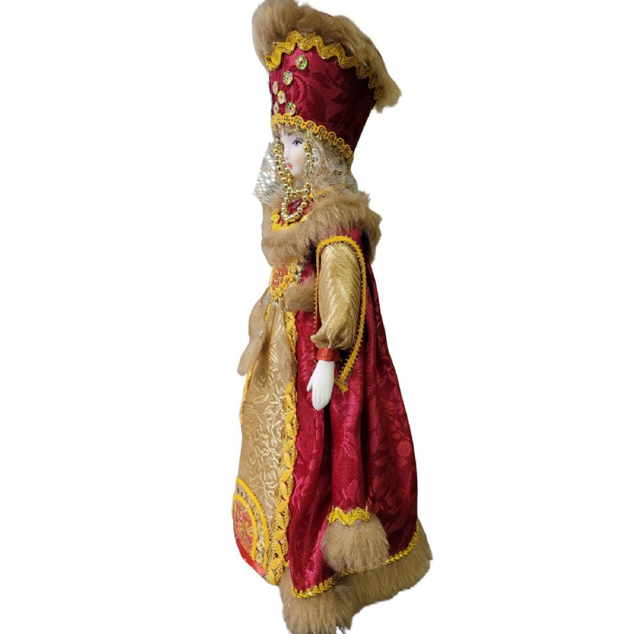 The doll is handcrafted by skilled artisans of Russian doll-making. The head and hands are made of bisque porcelain with a soft matte finish, and the face is hand-painted with tempera paints. The clothing is sewn from natural fabrics - brocade, satin, and braid - with meticulous attention to detail.