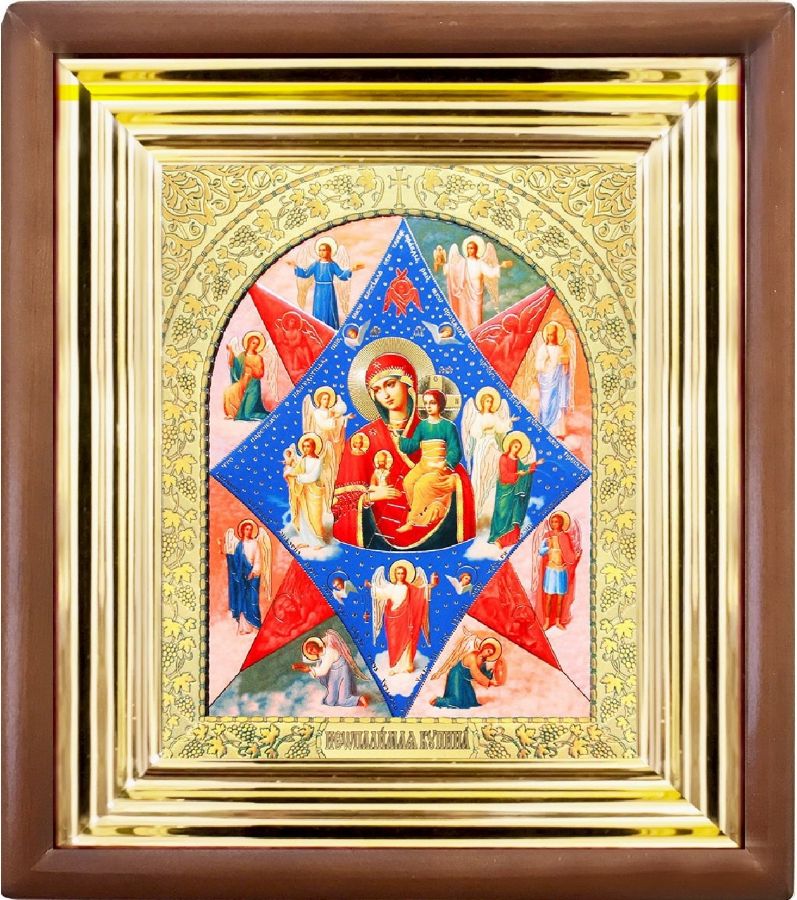 Mother of God Burning Bush is depicted in the form of an octagonal star, consisting of two sharp quadrangles with concave ends. One of them red, resembling fire, which announced the bush seen by Moses; another green, indicating the natural color of the bush, which it retained, enveloped in a fiery flame. In the middle of the octagonal star, as if in a bush, is depicted the Most Pure Mothe of God with the Eternal Child. At the corners of the red quadrangle are depicted a man, a lion, a calf and an eagle, symbolizing the four evangelists. In the hands of the Blessed Virgin there is a ladder, with the upper end leaning against Her shoulder. The staircase means that through the Mother of God the Son of God descended to earth, raising all those who believe in Him to Heaven.
