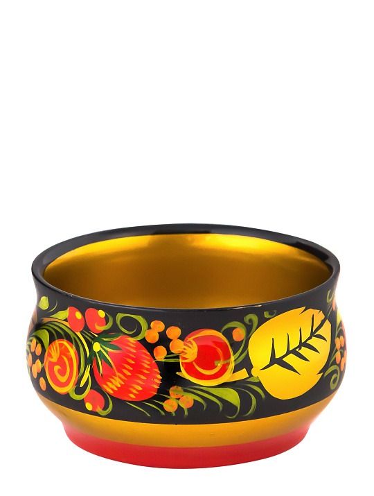 The Khokhloma dessert bowl is a fine example of Russian folk craft in a compact form. Hand-carved from wood and hand-painted with traditional Khokhloma floral designs in rich gold and red over black.